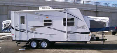 Sleeps 6 3 Burner High Output Gas Range Laminated Countertops All Roof Ducted A/C 6 Gallon Gas Water Heater Water Heater By-Pass 120 Volt GFI Protected Circuit(s) Phone Jack Bathroom Skylight Outside Storage Compartment TV Antenna and Cable Hookup Digital AM/FM/CD w/ Remote Microwave Oven Indoor/Outdoor Table Functional Length - 21’ 10” Exterior Width – 96” w/o Awning Exterior Height -9’ 9” w/ AC Tire Size - 14 in. (36 cm) Furnace BTU - 20,000 Fresh Water Tank - 30 gal. Gray Water Holding Tank - 30 gal. Black Water Holding Tank - 30 gal. Converter w/ Charger - 55 AMPS Towing Class 3 Receiver Required Round-7 Electrical Connector Electric Brakes 2 5/16” ball required & furnished Weight Distribution - Anti-Sway Bars 5 Day Rate is $505